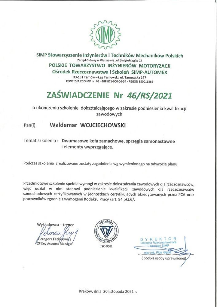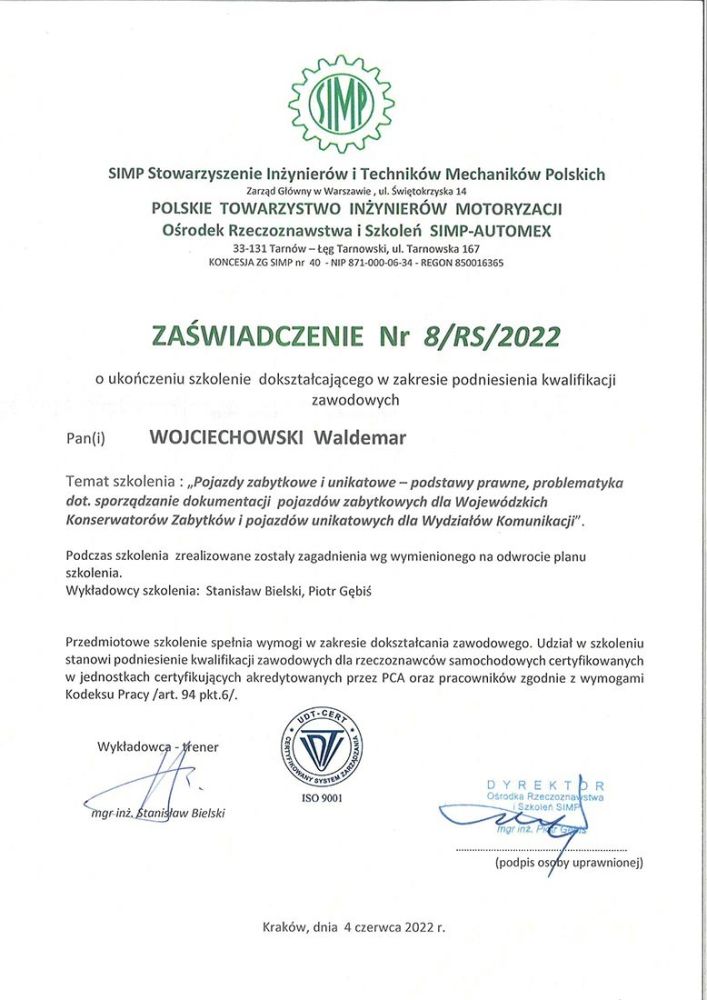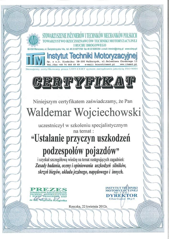 Rzetelność opinii technicznych opieramy na solidnych kwalifikacjach, wieloletnim doświadczeniu oraz aktualnych uprawnieniach zawodowych. Poniżej prezentujemy certyfikaty i dokumenty potwierdzające nasze kompetencje jako rzeczoznawcy SIMP.